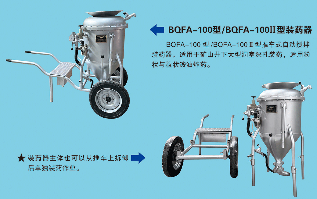 BQFA型自動攪拌系列裝藥器,與人工攪拌相比,無需人工攪拌,節省人力且攪拌均勻,移動方便,操作簡單便捷,大大降低人工勞動強度,提高裝藥密度、爆破質量,減少施工作業時間。先后出口塔吉克斯坦、老撾,秘魯,尼日利亞、法國等國家,使用情況反饋中得到一致好評并大力推薦。