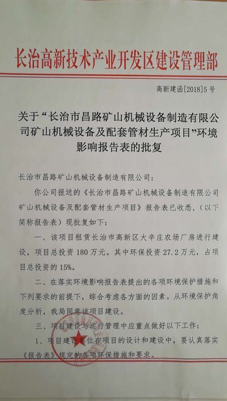 關于“長治市昌路礦山機械設備制造有限公司礦山機械設備及配套管材生產項目”環境影響報告表的批復
